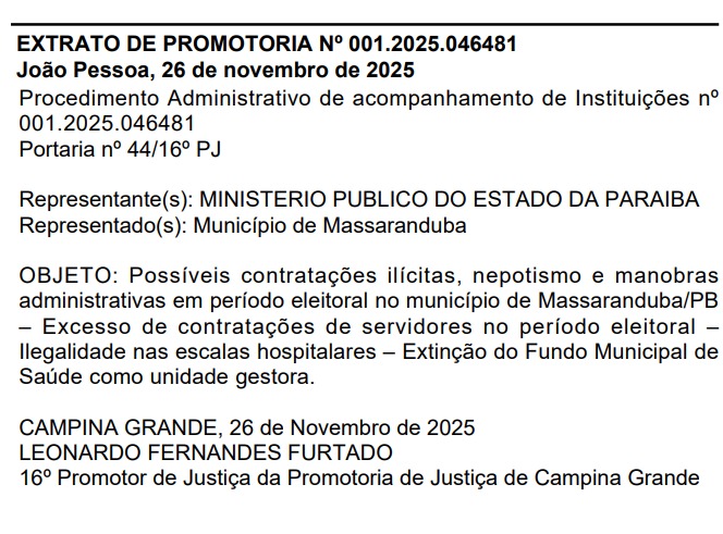 O procedimento, registrado sob o número 001.2025.046481, apura suspeitas de contratações ilícitas, nepotismo, manobras administrativas em período eleitoral e irregularidades na área da saúde municipal. Entre os pontos investigados estão o excesso de contratações temporárias durante o ano eleitoral, problemas na elaboração das escalas hospitalares e a possível extinção ou retirada do Fundo Municipal de Saúde de Massaranduba como unidade gestora junto ao sistema Sagres do Tribunal de Contas do Estado.