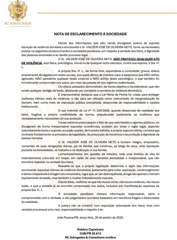 O advogado Robério Capistrano afirmou, durante entrevista ao programa Ô Paraíba Boa, da rádio 100.5 FM, que o empresário Valderi José de Oliveira Neto não cometeu violência contra a esposa no episódio que resultou em sua prisão no último domingo, em um condomínio de luxo. A entrevista, conduzida por Fabiano Marques, Jaceline Marques e Dayana Lucas, foi marcada por momentos de tensão entre o advogado e as apresentadoras.